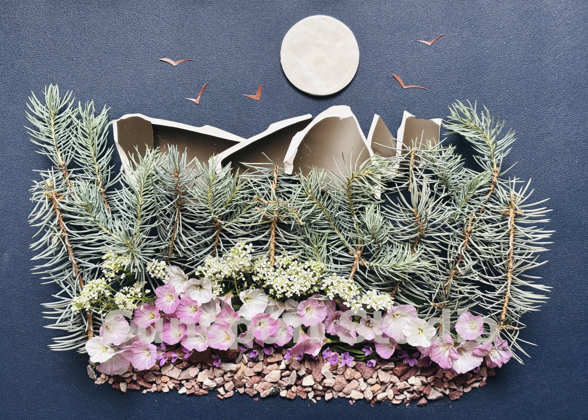 Rocky Mountain Night shows a calm mountain evening under a dark sky, with the moon casting light across rugged peaks. Spruce trees, morning glory, and sprigs of baby's breath fill the foreground, while birds soar quietly overhead. The scene feels simple and still, a snapshot of the Rocky Mountains at night.