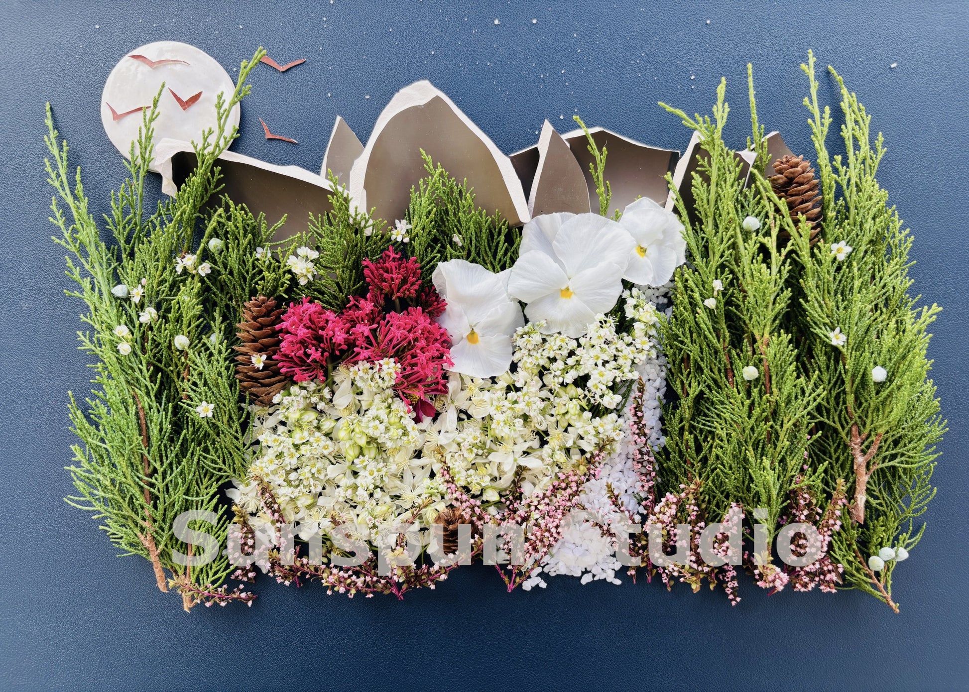 Winter Solstice unfolds beneath a deep blue night sky, with a pale moon casting soft light over dark juniper trees. A white path winds through the scene, blanketed as if with fresh snow. White pansies and delicate pink calycina peek through, mingling with small white blooms that shimmer like frost. The air feels crisp and still, a quiet winter night held in gentle light.
